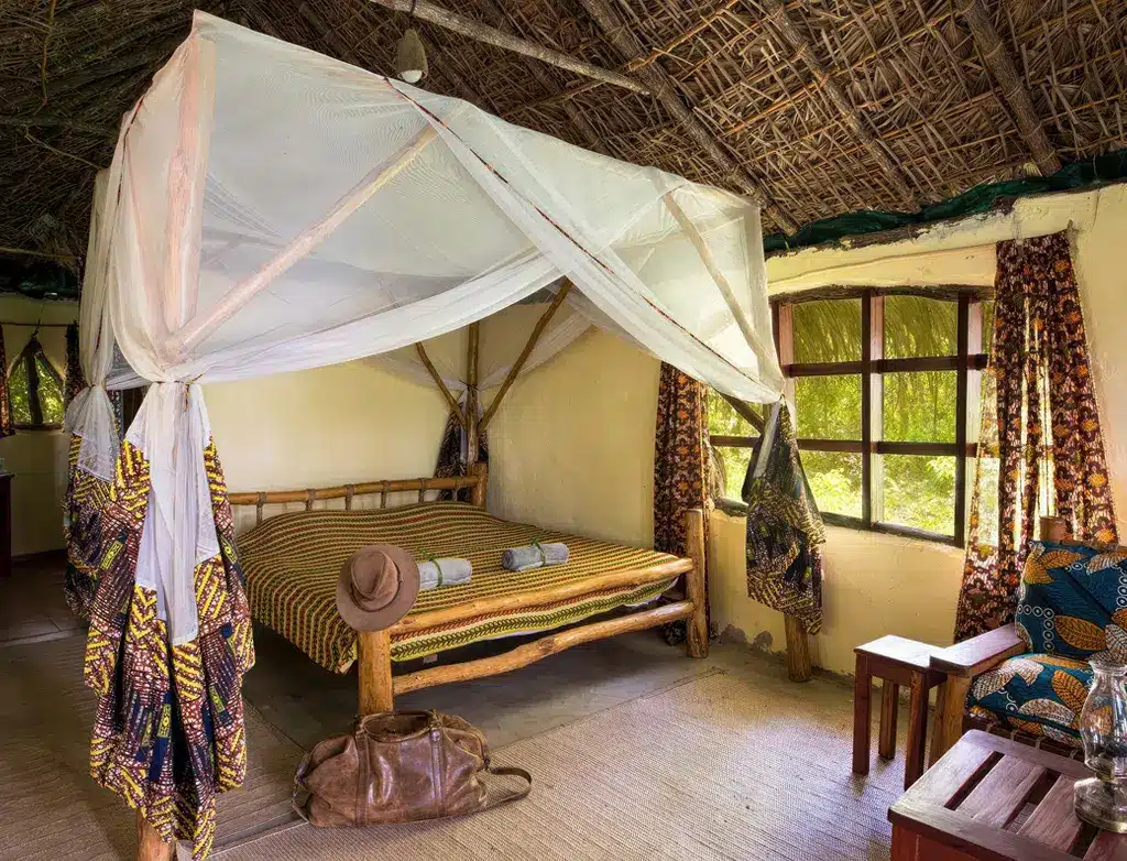 You’ll be staying at Selous River Camp as your base for visiting Nyerere National Park. The camp sits high above the banks of the Selous River, and there are beautiful sunset views from the swimming pool, bar, and restaurant. Accommodation is in mud-walled bungalows or simple tents. You’re not far from the park entrance, and frequent visitors to camp include elephants and black-and-white colobus monkeys. The peaceful setting allows you to fully unwind while still being close to the park’s main attractions, offering an authentic bush experience that blends comfort with a true sense of wilderness, and providing easy access to game drives and boat safaris along the Rufiji River.